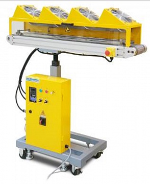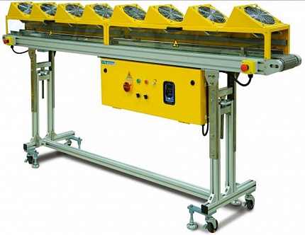 Охлаждающие воздушные конвейеры предназначен для встраивания в экструзионную линию по производству гранулята, из полимеров чувствительных к воде или имеющих трудности при водяном охлаждении стренги. Конвейер имеет ленту из сетки нержавеющей стали, которая позволяет воздуху проходить сквозь полотно. Обдув стренги осуществляется при помощи 10 мощных вентиляторов (4 вентилятора для LAC 1.2). Конвейер оборудован двигателем переменной скорости привода ленты.