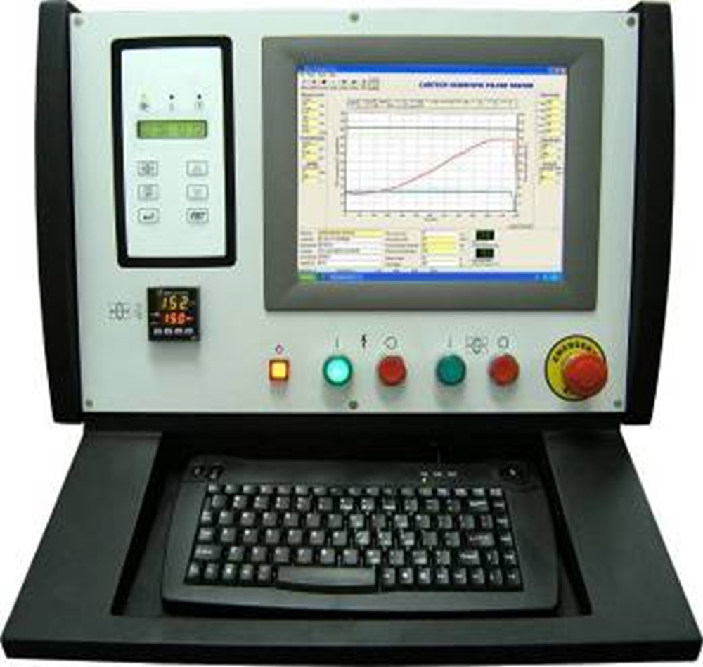 Компьютерная система управления и контроля, позволяет задавать условия и фиксировать результаты всех испытаний Параметры испытания можно вводить при помощи клавиатуры с большим трекболом, установленном на панели управления как показано справа. Это облегчает использование прибора по сравнению с сенсорным экраном, потому что параметры работы и данные по сериям можно задавать при помощи клавиатуры так же как вы работаете с нормальным ПК. Большая центральная графическая зона на экране отображает непрерывно обрабатываемые кривые давления перед шестеренчатым насосом, давление на фильтре и температуру расплава перед и после шестеренчатого насоса. На экране компьютера, вы видите в реальном времени рост давления на фильтре.
